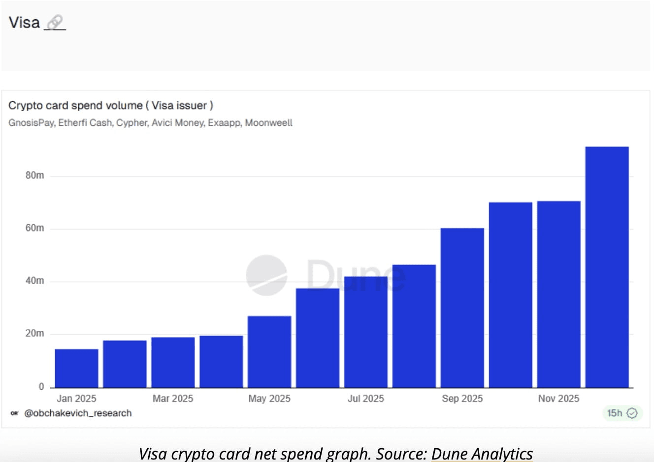 Le spese liquide in un gruppo di carte crypto emesse da Visa sono aumentate del 525% nell'arco dell'anno, passando da 14,6 milioni di dollari a gennaio a 91,3 milioni di dollari entro la fine di dicembre, secondo i dati di Dune Analytics.