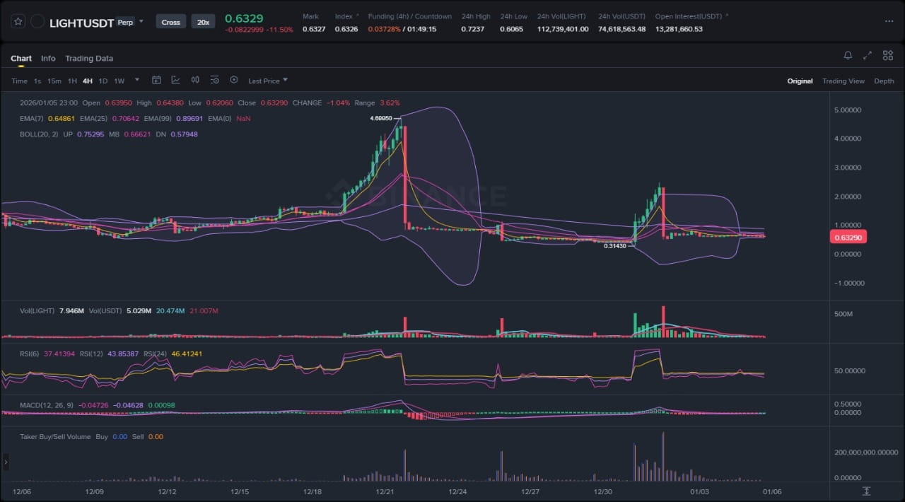 LIGHT ha negoziato in un range ben definito nelle ultime settimane, delimitato da massimi di swing vicino a 0,2650 e minimi di swing intorno a 0,2029. La struttura complessiva rimane neutrale, senza confermare né un trend rialzista né una rottura ribassista, poiché il prezzo oscilla all'interno delle bande di Bollinger che si sono contratte, segnalando una riduzione della volatilità e un potenziale movimento esplosivo. La media mobile esponenziale a 7 si trova sopra la media mobile esponenziale a 25, ma entrambe si stanno appiattendo sotto la media mobile esponenziale a 99, indicativo di un range correttivo successivo a un precedente movimento impulsivo ribassista dai massimi mensili. Questo setup tipizza una fase di distribuzione in fase di conclusione, con liquidità che si accumula al fondo del range per un possibile assorbimento da parte dei compratori.