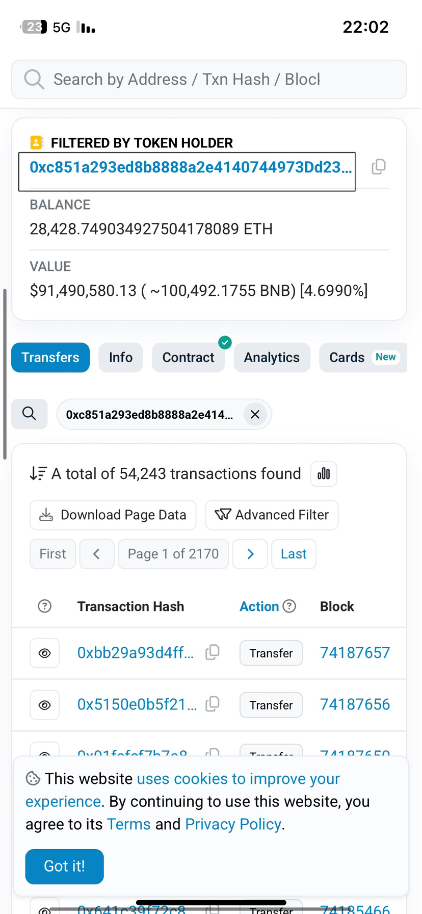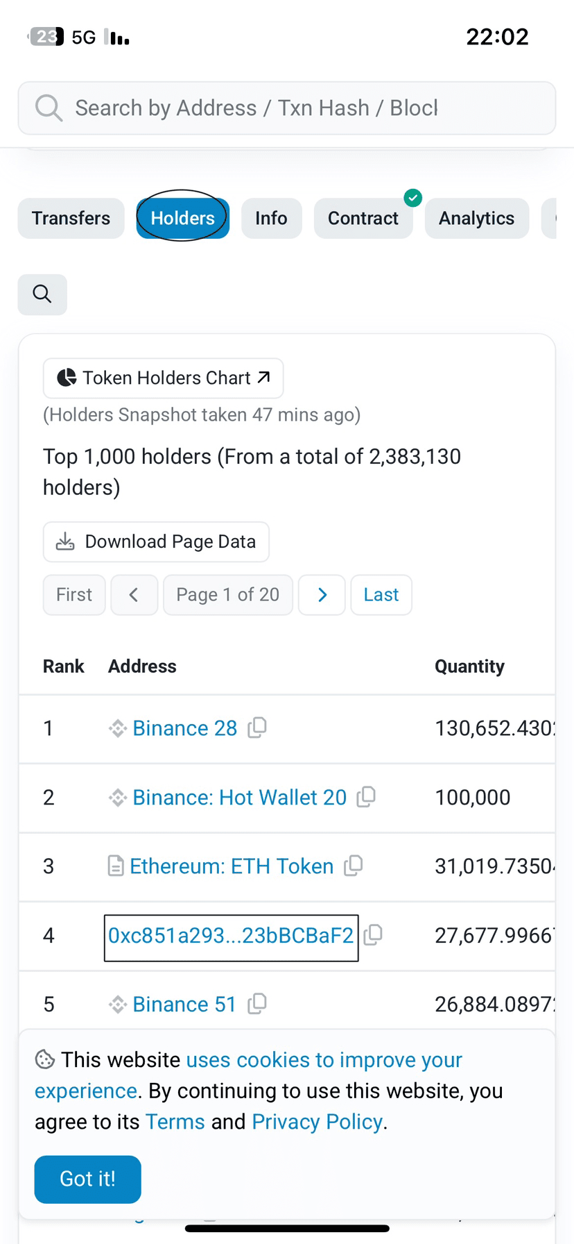 Dopo aver aperto BscScan, scendi leggermente fino a trovare Transfers e accanto a esso Holders. Cliccando su Holders ti verranno mostrati tutti i portafogli dei