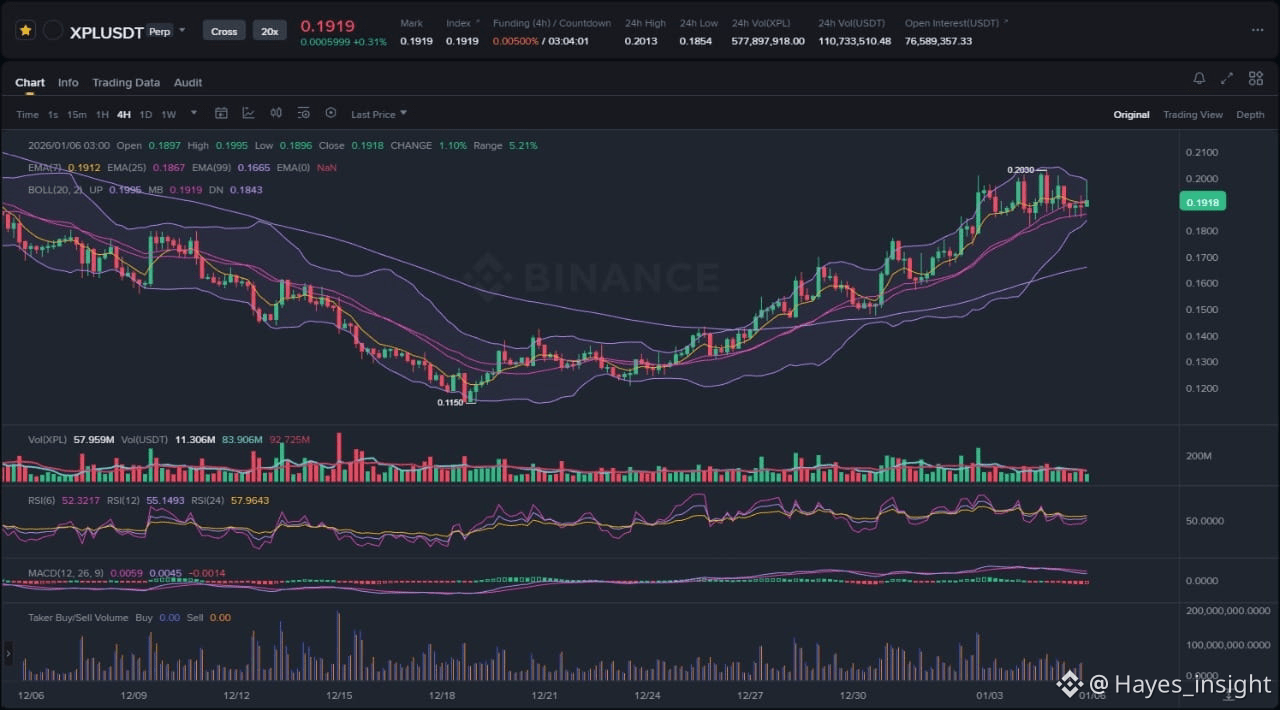 XPL's price action reflects an uptrend structure attempting a breakout from a multi-week range, with the 7-period EMA sloping upward and crossing above the flattened 25-period EMA, while the 99-period EMA provides dynamic support near recent lows. Candles are trading within the upper half of expanding Bollinger Bands, signaling volatility expansion after a period of consolidation. Observable elements include an impulsive five-wave advance from the range bottom around 0.13, followed by a flag-like consolidation rejecting lower shadows at 0.16, and a local swing high retest at 0.18 before mean reversion pulled it back to 0.17. This positions XPL in a bullish channel, with price respecting the EMA stack as liquidity pockets build below.