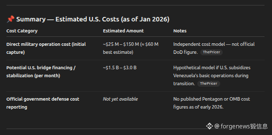 The immediate tactical cost of the Venezuela operation — based on reasonable unit cost models — appears relatively modest in defense budget terms (tens of millions), but this doesn’t capture longer-term commitments that may arise.