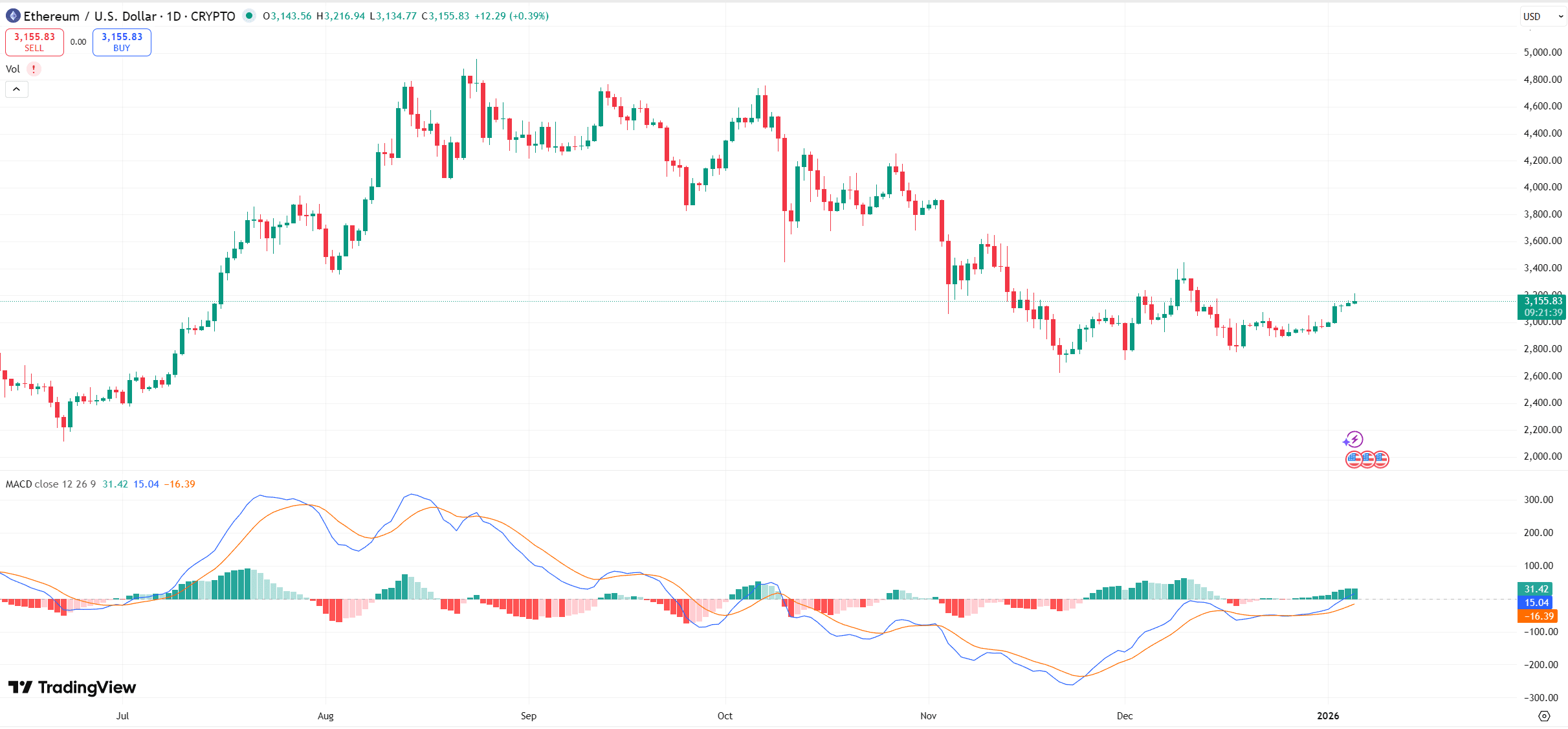 Fino alle 22:40 del 5 gennaio, ETH è a circa 3155,83 dollari, +0,39% nelle ultime 24 ore