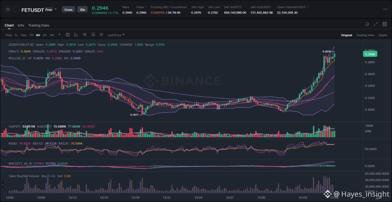 FET currently trades at approximately $0.2646, reflecting a decisive breakout from a multi-month downtrend that dominated since mid-2025. The price action exhibits a clear impulsive upward thrust, piercing through prior resistance zones and local swing highs established around $0.22 earlier in the period. Over the visible timeframe, spanning recent weeks, FET has transitioned from a tight bearish channel—characterized by lower highs and lower lows—into an emerging uptrend structure. The 7-period EMA has crossed bullishly above the 25-period EMA, with both now angling upward toward the flatter 99-period EMA, signaling potential mean reversion from oversold conditions. Bollinger Bands have expanded notably, with price hugging the upper band post-breakout, indicative of volatility expansion and strong directional momentum rather than mere range-bound oscillation. This setup points to a breakout attempt rather than a simple range or retracement, as the structure rejects prior downtrend lows around $0.20.