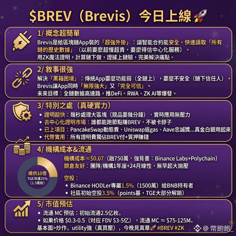 1/ 概念超簡單 Brevis是給區塊鏈App裝的「超強外掛」:讓智能合約能安全、快速讀取「所有鏈的歷史數據」(以前要麼超慢超貴,要麼得信中心化服務)。用ZK魔法證明,計算鏈下做,證據上鏈驗,完美解決痛點。