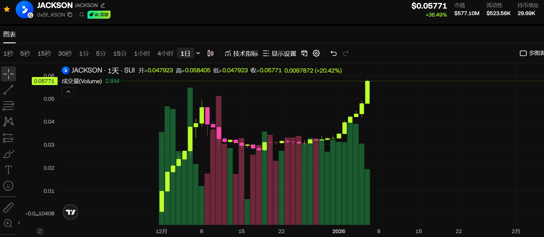 Stato attuale: entrati nel gennaio 2026, $JACKSON continua a mostrare una forte crescita, con il community che riporta ripetutamente la rottura del nuovo massimo storico di $0,055, con un aumento complessivo dal punto più basso superiore al 500%.