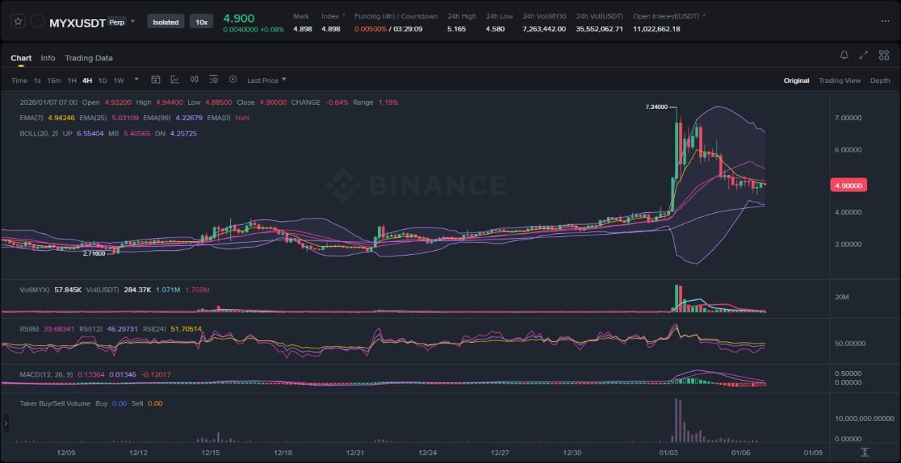Le ultime tre notizie su MYX dipingono un quadro misto, coagulandosi in due temi principali: potenziale di crescita a lungo termine e volatilità del sentiment a breve termine. In primo luogo, l'innovazione specifica del progetto emerge come un tema rialzista, evidenziato dalla prospettiva positiva di CoinPedia del 6 gennaio 2026, prevedendo che MYX potrebbe salire a $30 entro il 2026 e $50 entro il 2030, guidato da avanzamenti nei derivati cross-chain e un aumento dell'attività on-chain. Questa narrazione sottolinea il posizionamento di MYX come potenziale leader nei futures decentralizzati, con i punti salienti della storia che enfatizzano il momentum se l'adozione rispecchia i colleghi come dYdX o GMX. Il sentiment rialzista qui si allinea con la struttura di tendenza rialzista del grafico, potenzialmente alimentando una continuazione se le integrazioni nel mondo reale si materializzano.