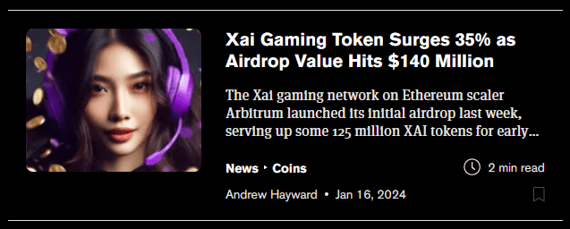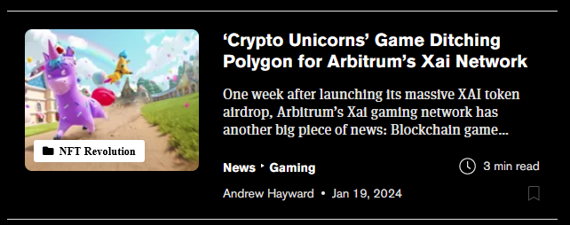 Xai, la rete di gioco di terzo livello costruita sulla soluzione di scalabilità di Ethereum Arbitrum, ha dato il via al 2024 in modo vistoso, lanciandosi per primo ai primi sostenitori$XAI token, e poi ha annunciato che il noto studio di giochi NFT Laguna Games avrebbe portato Crypto Unicorns e giochi correlati sulla rete. Quindi cosa succede dopo? Sicuramente più giochi.