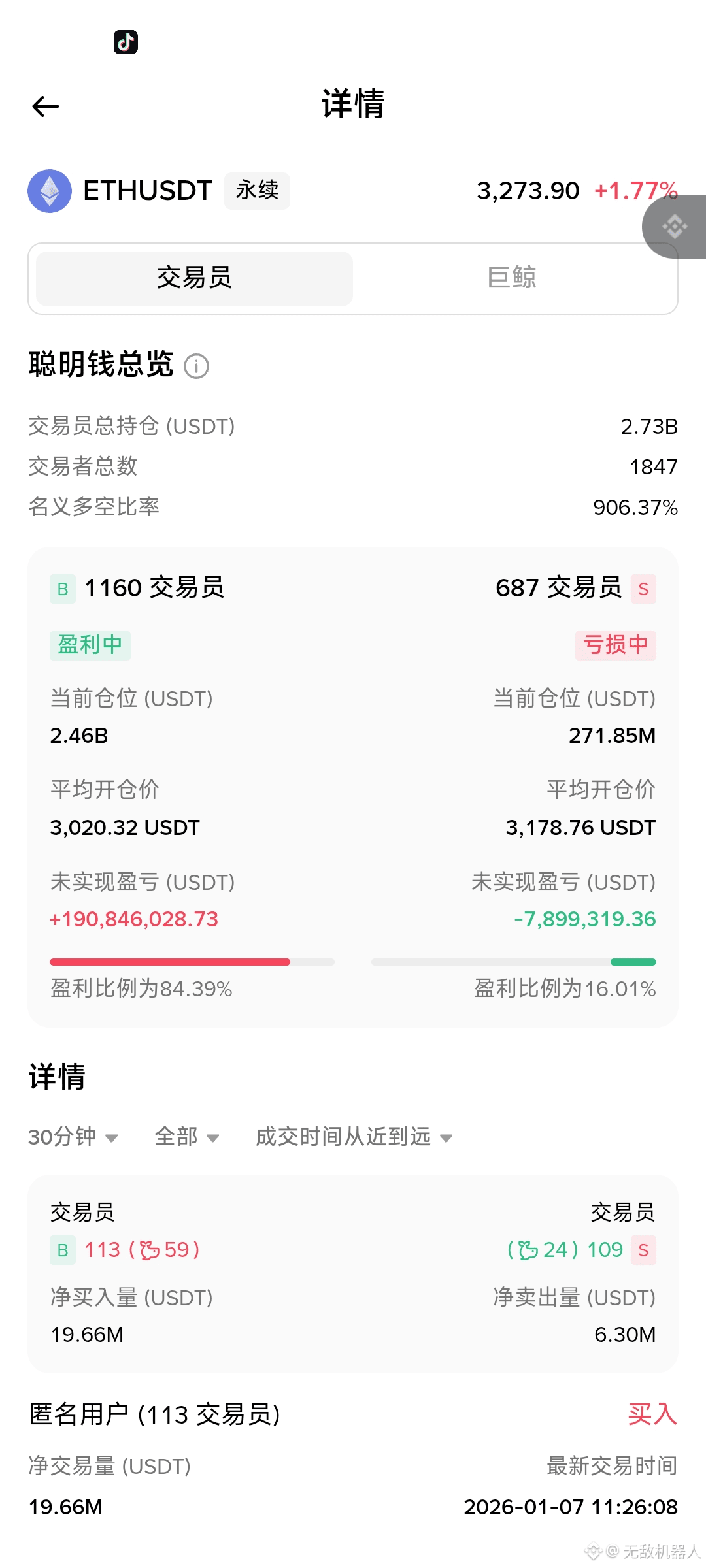 通过对聪明钱的计算,当前市场多空比惊人,多头只需要往上推高到一定值,会让空投大幅度爆仓和减仓。