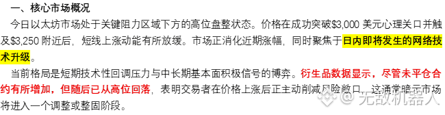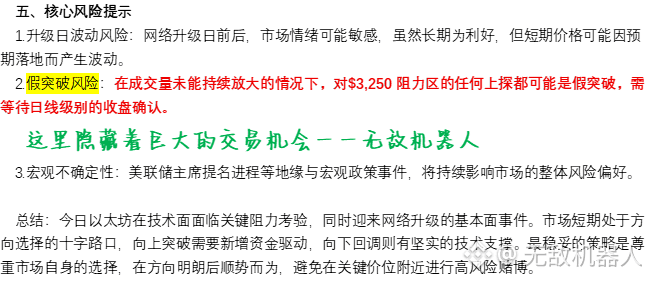 尊敬的交易员,按照昨天的交易报告和提醒,以太坊突破3250前别做单,多做右侧,突破3250后猛拉到3305,但是由于多军车太重回调到3220。