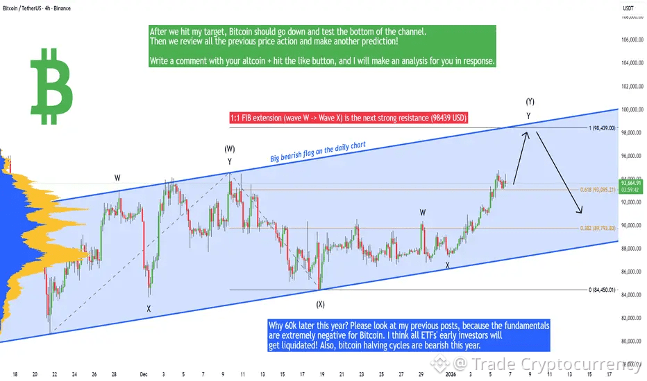 In the short term Bitcoin is forming an ascending parallel channel projection or a bearish flag, so if the price hits the upward trendline, that's a good time to open a short position or take profit on your long position. After that we can go all the way down to the bottom of the channel and test the upward-sloping trendline at around 89k. Why 60k later this year? Please look at my previous posts, because the fundamentals are extremely negative for Bitcoin. I think all ETFs' early investors will get liquidated! Also, bitcoin halving cycles are bearish this year.