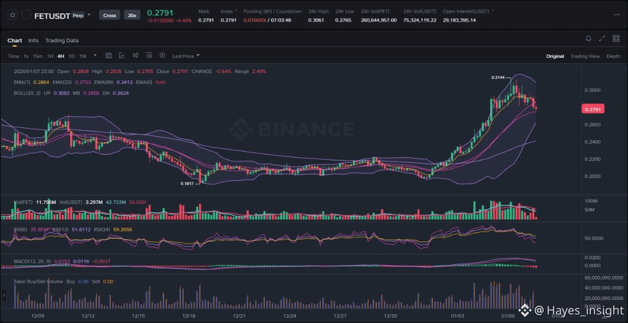Delving deeper into the price structure, the chart's local swing lows around $0.22 earlier in the period formed the channel's base, with the breakout volume spike—over 50% above average—validating institutional or whale accumulation. Post-breakout, we've seen a flag-like consolidation, a classic continuation pattern in uptrends, where price respects the 25 EMA as support. If this holds, it positions FET for a measured move extension, projecting toward the channel's projected upper target. However, the 99 EMA near $0.28 acts as a pivotal resistance; a decisive close above it would solidify the uptrend. Conversely, failure here could lead to range-bound trading between $0.24 and $0.29, trapping early entrants in a distribution phase.