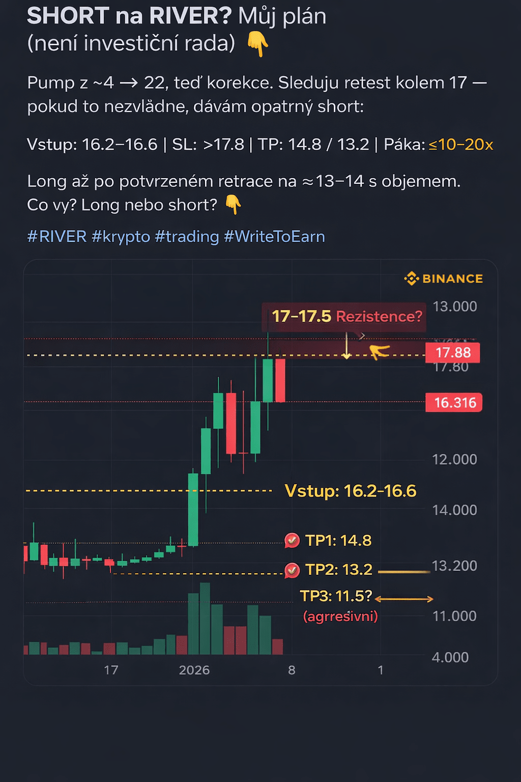 Pompa da ~4 → 22, ora correzione. Sto osservando il retest intorno a 17 — se non ce la fa, metto un short cauto.