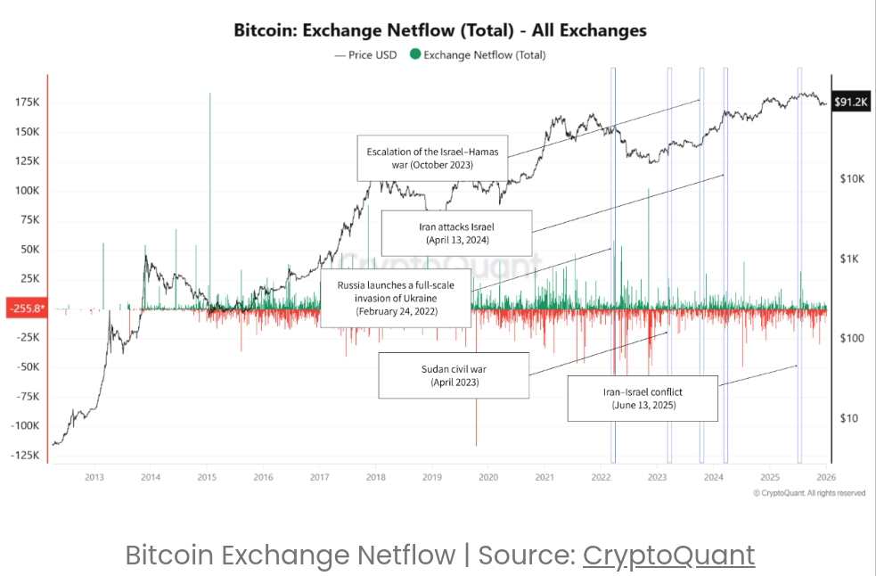 Tuttavia, i dati sul blockchain raccontavano una storia più tranquilla. I flussi netti degli scambi, che registrano se le monete vengono spostate sugli scambi per essere vendute o rimosse per essere detenute, raramente si sono deteriorati in modo duraturo durante quegli eventi. Dal 2023, il mercato ha mostrato una crescente capacità di assorbire shock geopolitici localizzati senza scatenare un'ampia liquidazione.