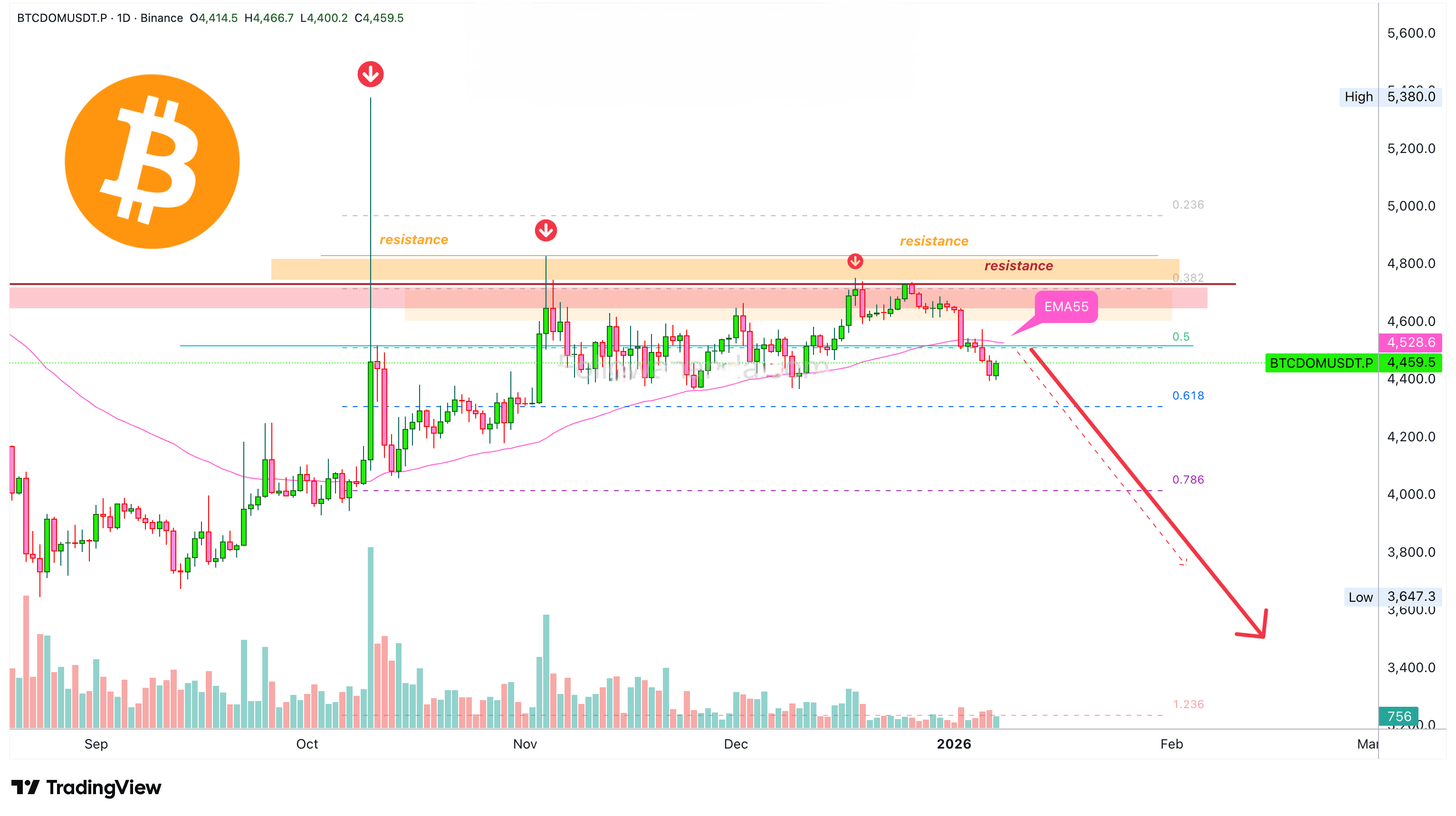 Questo movimento che ha terminato rompendo EMA55 come supporto è iniziato il 18-dicembre 2025, è normale vedere un ritracciamento dopo che un livello forte è stato conquistato. Qui, un ritracciamento può durare 1-3 giorni. Successivamente, quando EMA55 viene testato come resistenza, una volta che tiene, otteniamo una continuazione ribassista ed è allora che il boom del mercato! si manifesterà.
