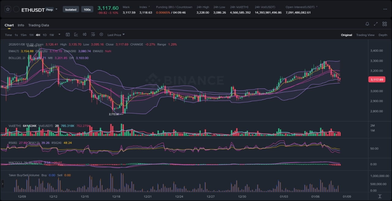 Il mercato Ethereum attualmente mostra una fase di consolidamento all'interno di una tendenza al ribasso più ampia, come dimostrato dal prezzo che si trova al di sotto della EMA a 7 periodi a circa 3205, della EMA a 25 periodi a 3220 e della EMA a 99 periodi a 3280 sul grafico a 4 ore. Questa posizione al di sotto delle EMAs suggerisce un controllo ribassista, con il prezzo che forma un range stretto tra minimi di swing locali intorno a 3100 e massimi di swing vicino a 3250. Le bande di Bollinger mostrano una volatilità contratta, con il prezzo che si appoggia alla banda inferiore dopo un rifiuto dalla banda media, indicando potenziali opportunità di correzione verso la media, ma anche un rischio aumentato di una rottura al ribasso se il supporto dovesse cedere. Gli elementi osservabili includono un movimento impulsivo al ribasso dalla massima recente a 3320, seguito da una consolidazione che ha intrappolato la liquidità nell'intervallo 3150-3200, e una lieve espansione della volatilità sul timeframe inferiore che suggerisce una pressione crescente di distribuzione.