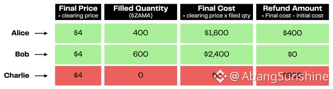 At the end of the bidding period, the auction smart contract goes from the highest bid price to the lowest price to allocate tokens to each participant: