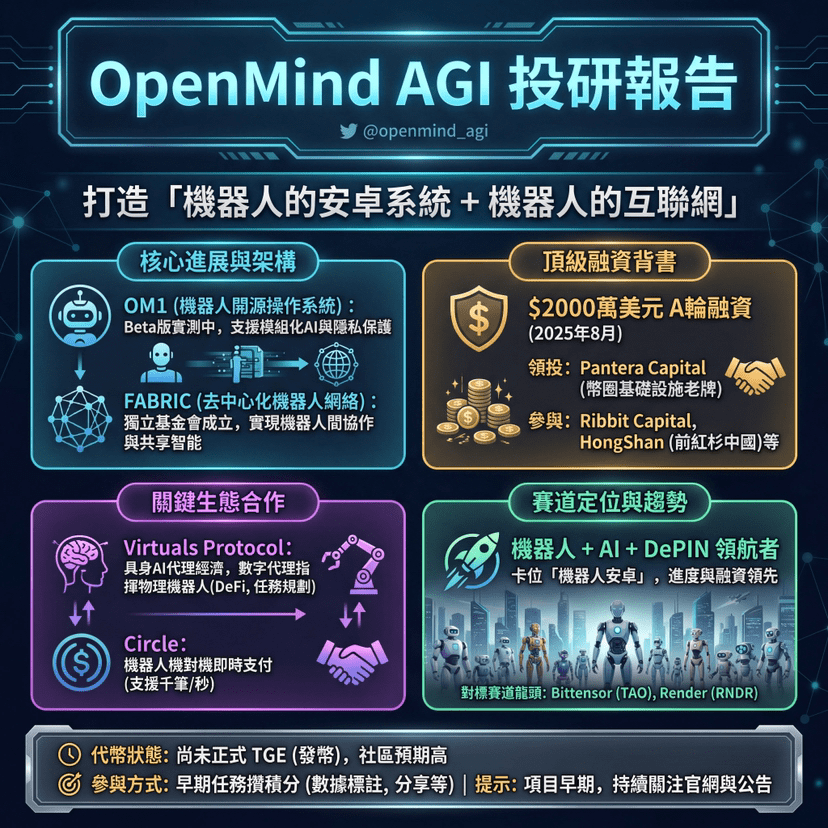 OpenMind (@openmind_agi) è un progetto focalizzato sul software di base per i robot, con l'obiettivo di creare un "sistema operativo per i robot + internet per i robot". In poche parole, permettere ai futuri robot (umanoide, a quattro zampe, domestici, di consegna, ecc.) di utilizzare lo stesso "cervello aperto" e "rete condivisa", riconoscersi, collaborare, condividere esperienze, e persino pagarsi autonomamente la ricarica o effettuare transazioni, creando così un vero e proprio "economia dei robot".