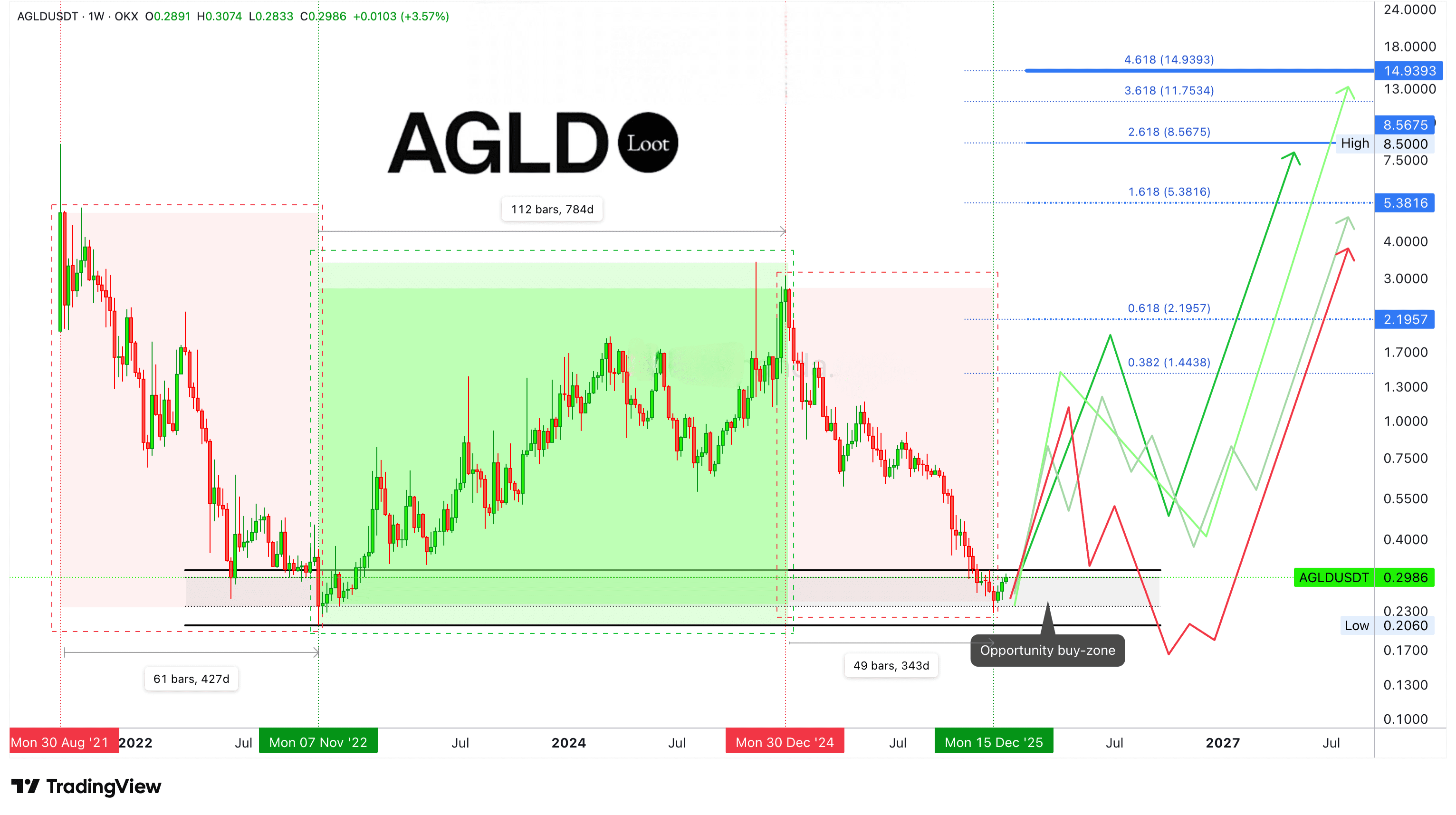 AGLDUSDT non ha raggiunto un nuovo minimo storico, quindi è possibile che ciò accada quest'anno. Una fase rialzista debole all'inizio del 2026 potrebbe portare a un grande crollo nel secondo e terzo trimestre di quest'anno, seguito da un forte recupero, portando infine a un aumento dei prezzi.