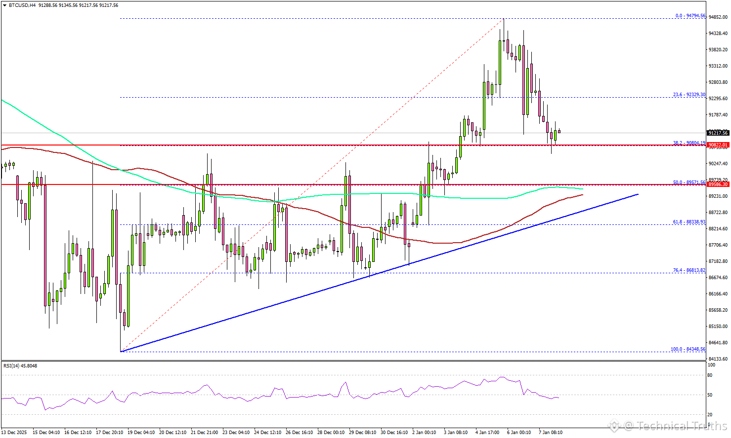 Price Action Overview: BTC Hefending the $89K–$90K support zone after rejecting $95K highs, forming a tight range with higher lows. Key support at $89,000 (recent low and EMA alignment); resistance at $92,500–$94,000 Fib levels. Breakout potential to $100K+ if NFP surprises dovish.16fcfff9f011 Polymarket odds for $100K in January at 29%—undervalued given macro setup.af563b