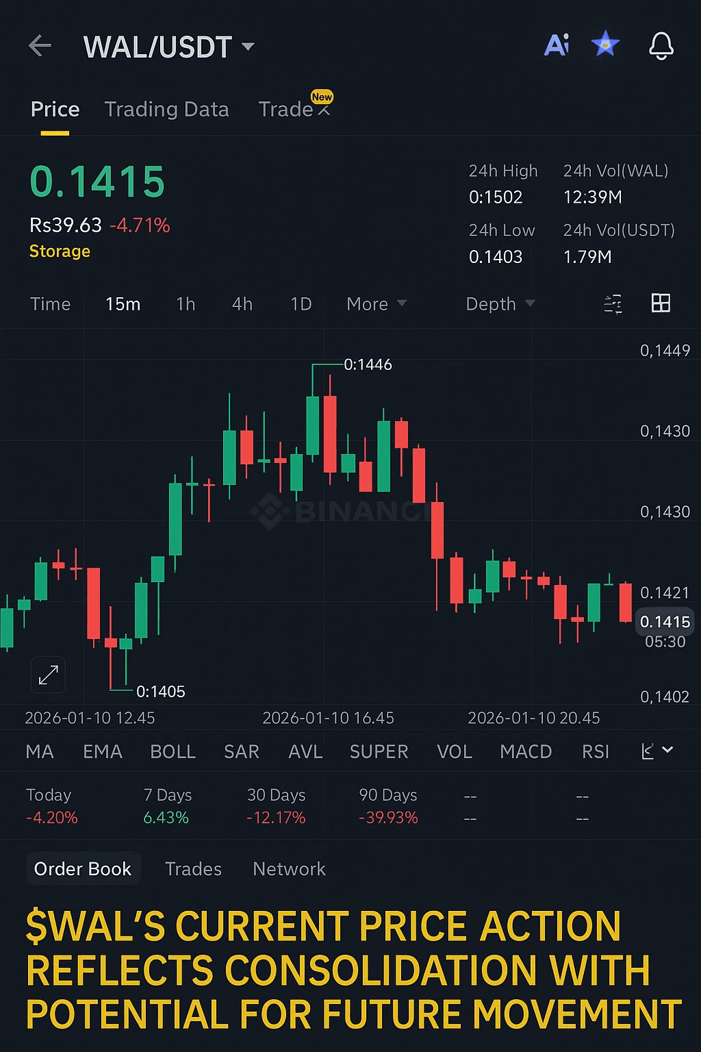 Negli ultimi periodi di trading, WAL ha dimostrato sia resistenza che volatilità, indicando che sebbene l'andamento a breve termine possa essere irregolare, esiste una forza sottostante in alcuni indicatori. Analizzando il grafico dei prezzi, $WAL si trova intorno a *0,1415 USDT*, con un recente massimo a 24 ore di 0,1502 USDT e un minimo di 0,1403 USDT. Ciò ci dice che c'è un'attiva domanda di acquisto sopra i livelli di supporto anche durante le correzioni. L'andamento recente del prezzo sembra confinato tra *0,14 e 0,15*, che è abbastanza tipico per un asset che si sta consolidando dopo movimenti precedenti.