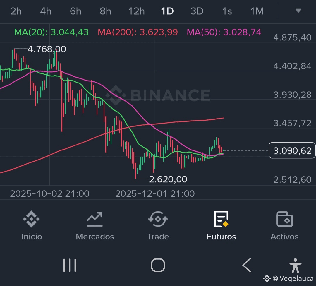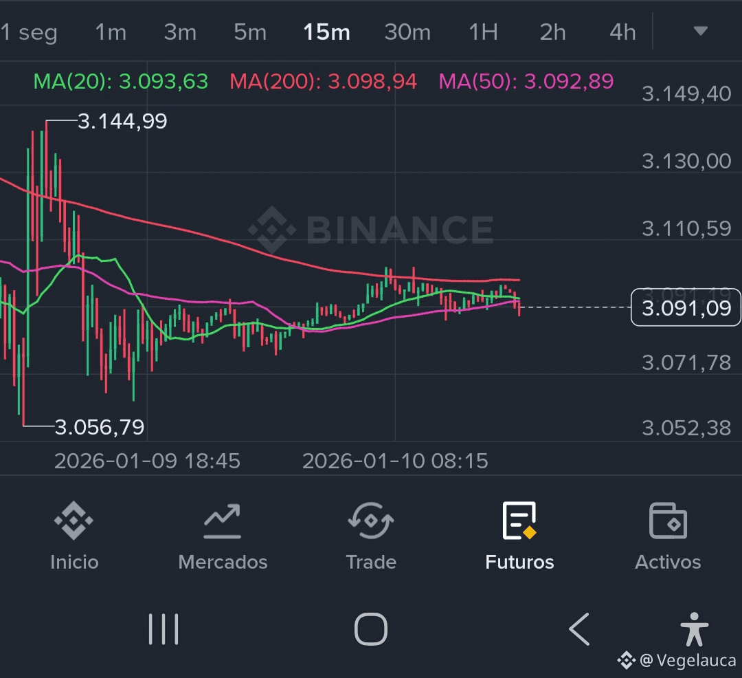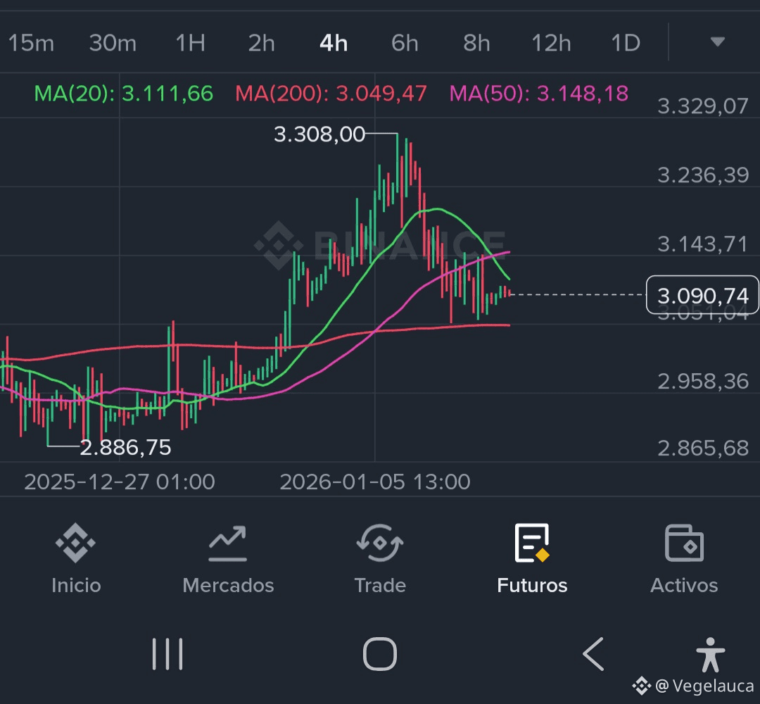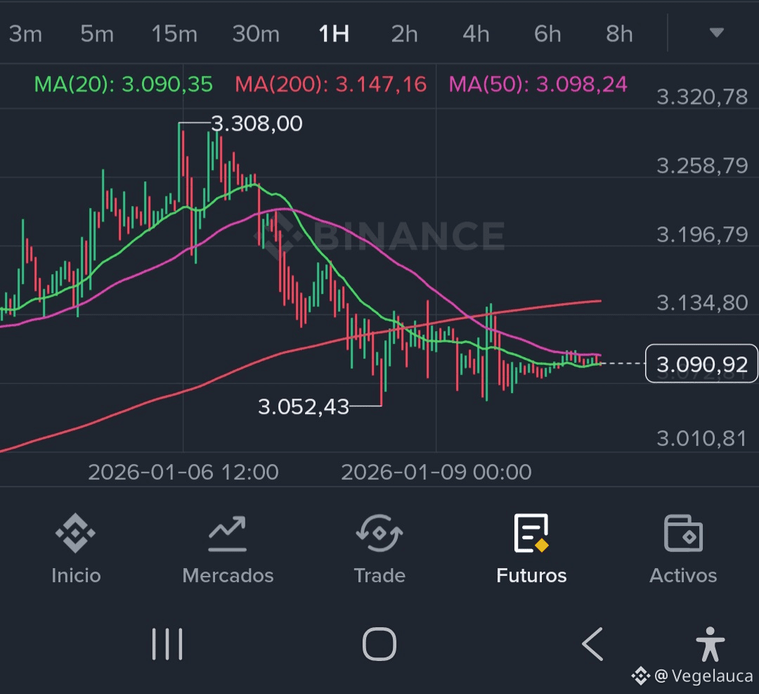 Cerramos una semana que nos recordó que el mercado no sube en línea recta. Tras un inicio que parecía prometedor buscando la zona de los 3.300 USDT, el mercado perdió fuerza y devolvió gran parte del recorrido, estabilizándose nuevamente cerca de los 3.090 USDT. La sensación general ha cambiado de una leve euforia a la cautela; el volumen ha disminuido en las últimas horas, dejando al precio en un rango de "espera" mientras el mercado digiere la reciente volatilidad.