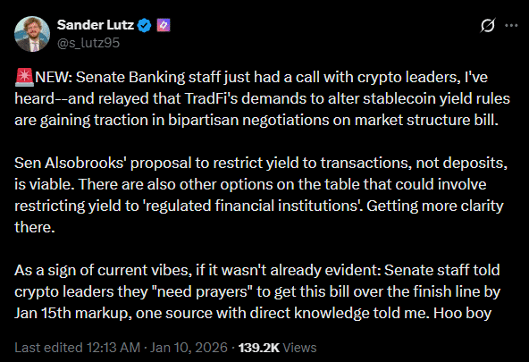 📅 Il conto è programmato per un voto di markup il 15 gennaio, ma le negoziazioni sono state riportate come spostate a favore delle richieste della finanza tradizionale (TradFi), allarmando diversi leader del settore crittografico.