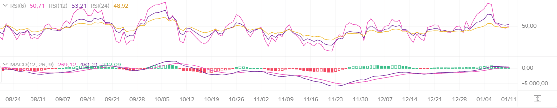 Anche il MACD si sta muovendo lateralmente, indicando una dinamica a breve termine bassa. Ma basso non significa necessariamente negativo — a volte riflette semplicemente un periodo di accumulo.