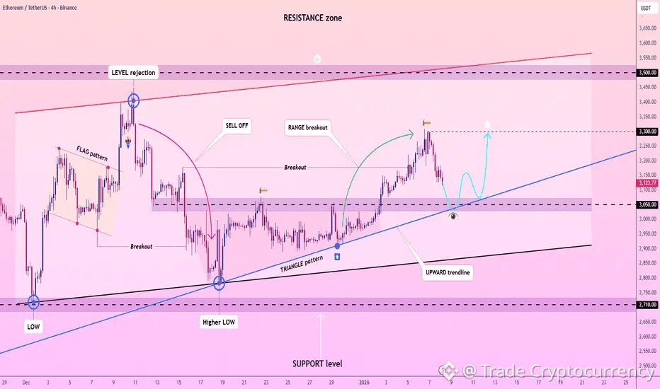 If ETH holds above the 3,000–3,050 support band, price could rotate higher toward 3,300, where prior supply and range highs converge. A successful push through that area may reopen the path toward the upper resistance zone.