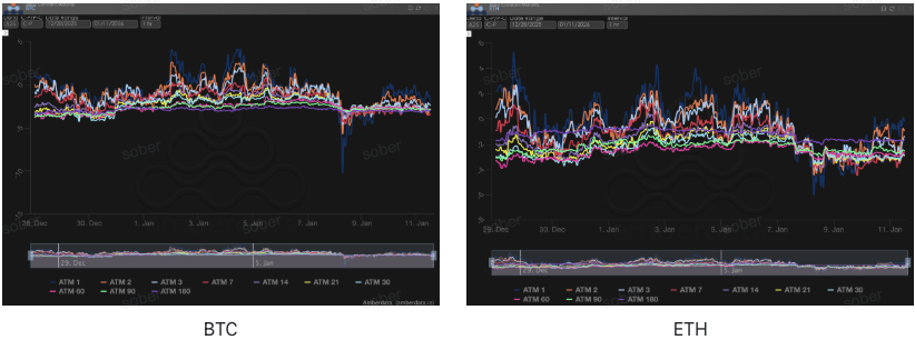 Rilascio di volatilità (Vol Crush): il calo complessivo dell'IV attuale, in particolare il collasso drammatico dell'IV a breve termine, indica che il premio per la volatilità istantanea (Instantaneous Volatility) causato dagli eventi geopolitici del 3 gennaio è praticamente scomparso. Il mercato sta correggendo la valutazione dei rischi sovrastimati.