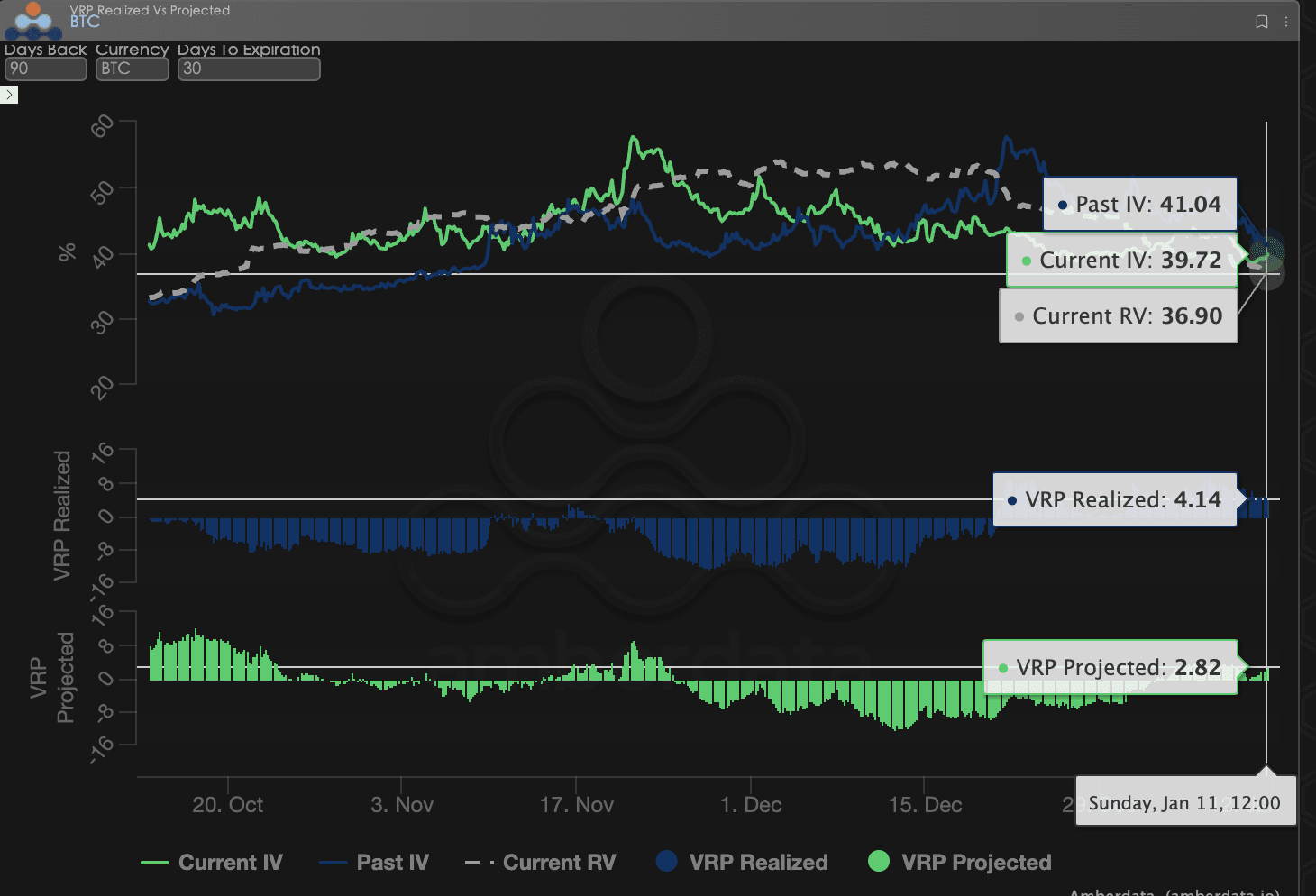 Correzione del modello: con l'avvicinarsi del giorno della sentenza del 14 gennaio, il VRP proiettato è diminuito, ma poiché la volatilità reale è ancora limitata dall'attuale mercato in oscillazione, il 'fattore di paura' nella valutazione delle opzioni rimane elevato, fornendo un ambiente continuo di guadagni sui premi (Premium Collection) per i venditori.