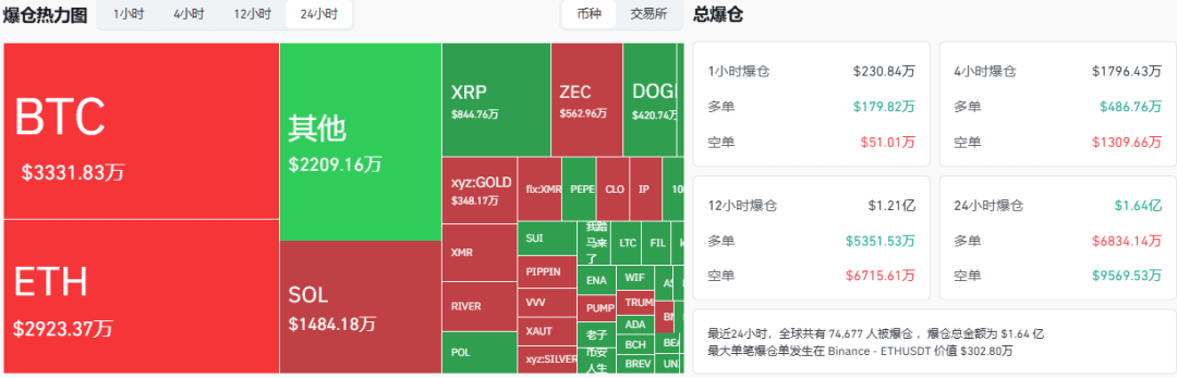 24小时全网共有74,677人被被爆仓,总额1.64亿美元,其中多头惨遭血洗($6834.14万),空头也难幸免($9569.53万)。