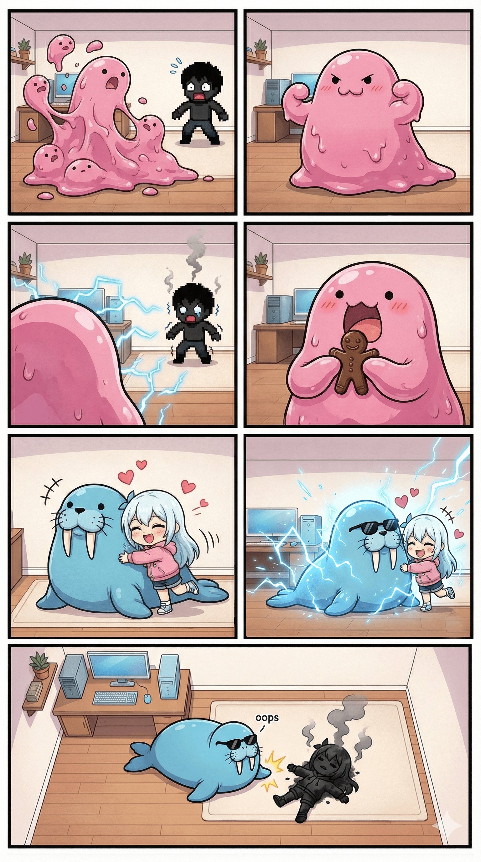 L'hacker colpì con una spada di pixel. Wally è subito diventato in modalità verde esplosiva (Blanka Mode), con un'espressione che diceva "Fai pure". L'ombra colpì e fu immediatamente folgorata.