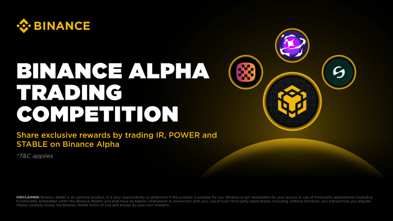 Binance ha annunciato tramite Binance Wallet l'avvio di una competizione di scambio sulla BNB Smart Chain all'interno di Binance Alpha, che permette agli utenti di scambiare IR – POWER – STABLE e competere per premi importanti in token.