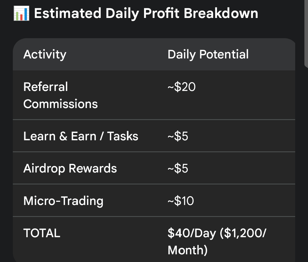 Obiettivo: con pochi trader attivi nella tua rete, guadagnare 15-20 dollari al giorno in commissioni è estremamente realistico. 💸