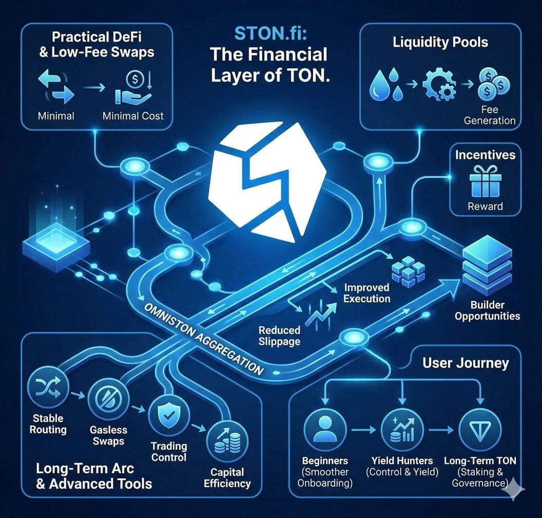 L'ecosistema TON si è mosso velocemente da esperimenti a DeFi reali e utilizzabili — e STON.fi è una grande ragione per cui. Ciò che una volta sembrava un insieme sparso di scambi e prodotti giocattolo ora si legge come uno stack finanziario stratificato: scambi con bassa frizione, liquidità componibili e un livello di aggregazione (Omniston) che collega tutto in modo che operazioni e strategie funzionino davvero nel mondo reale. Di seguito spiegherò cosa sta accadendo, perché è importante per diversi utenti (principianti, sviluppatori, cacciatori di rendimenti, detentori a lungo termine di TON) e gli svantaggi da tenere d'occhio.