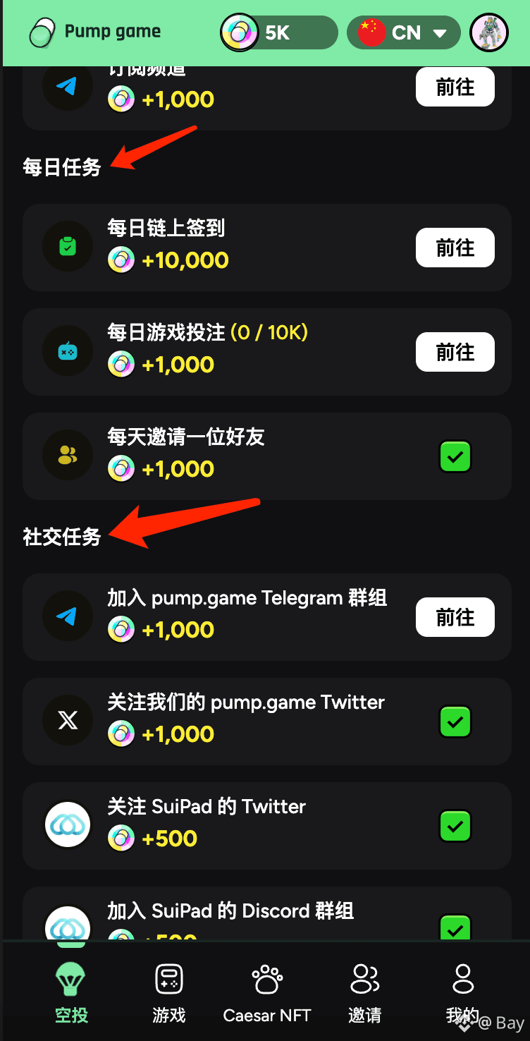 先完成基础任务 → 再刷每日 & 社媒 → 参与游戏 → 喂养 Caesar → 拉人 & 战队加成