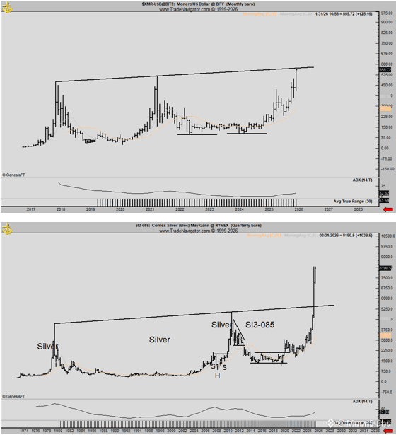 Veteran trader Peter Brandt has compared Monero’s current price structure to a historic breakout in silver. According to his analysis, both markets formed double tops before eventually breaking higher, triggering a powerful expansion move.