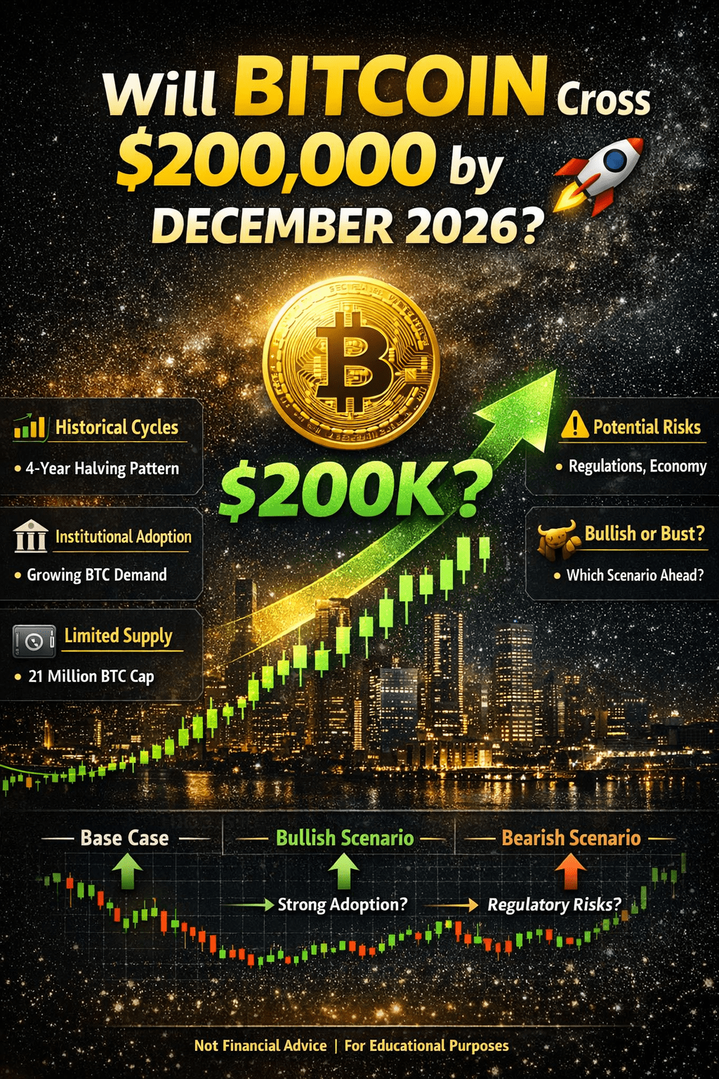 Raggiungere i 200.000 dollari entro dicembre 2026 è ambizioso ma non impossibile se il Bitcoin continua a maturare come un attivo digitale globale. I fattori chiave saranno l'adozione, la fiducia di mercato e le condizioni macroeconomiche.