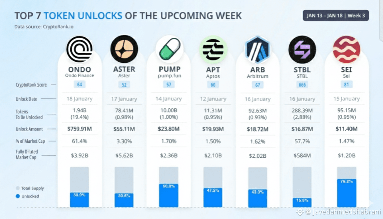 ONDO (Ondo Finance): The biggest event this week on Jan 18, with $759.91M being unlocked (a massive 61.4% of its Market Cap).
