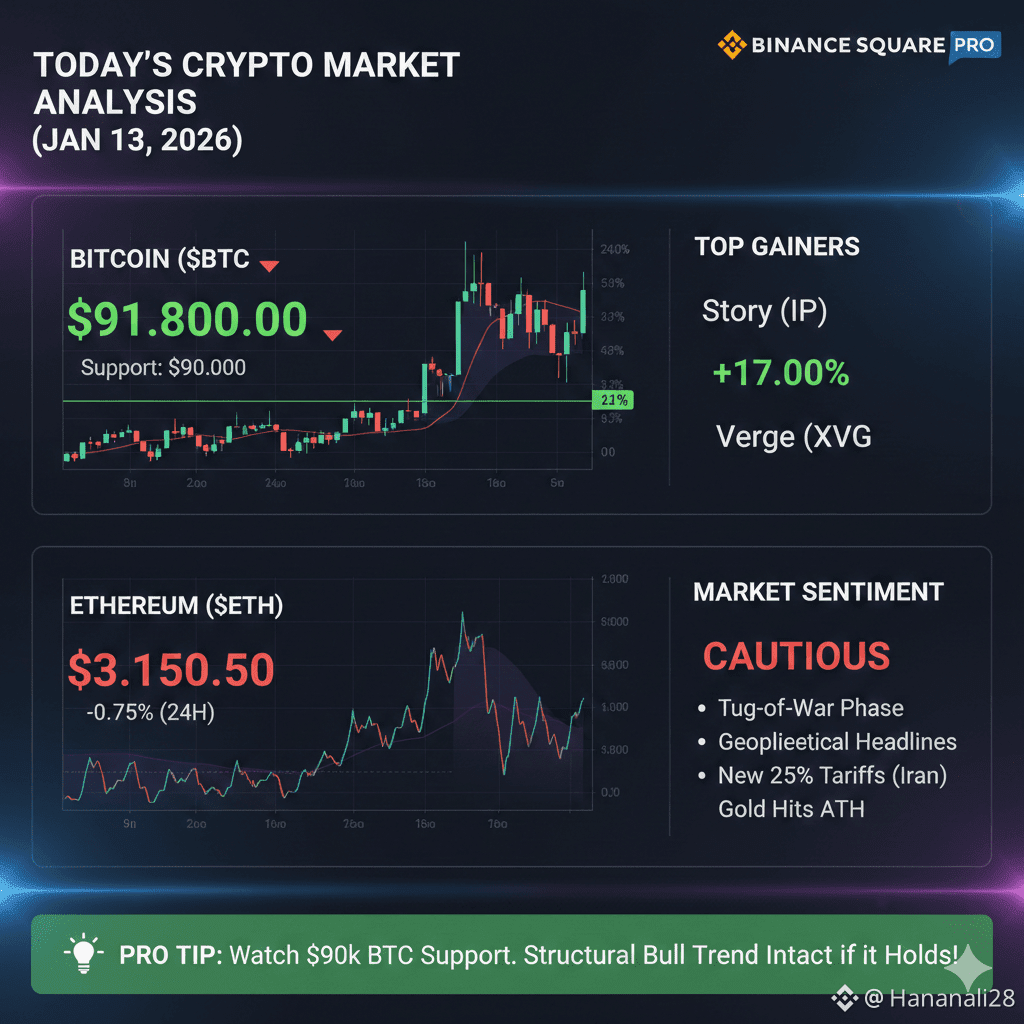 Bitcoin ($BTC): Currently trading around $91,800. It briefly touched above $92,000 but faced rejection. Support is holding firm at the $90,000 psychological level.