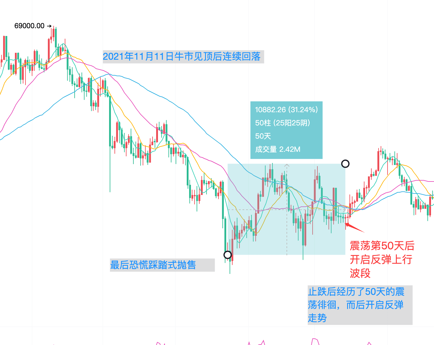 Sebbene attualmente siamo in una fase di mercato ribassista, il mercato ribassista non scende in modo continuo e repentino; le medaglie ritengono che, dopo un forte ribasso iniziale, il prezzo possa rilasciare acquisti long e ritardare il ciclo ribassista. Se si considera la previsione profonda basata sul movimento del BTC dalla fine di ottobre a metà novembre dello scorso anno, in realtà ci vorrebbero meno di 4 mesi per completare l'intero processo di mercato ribassista, il che è un po' irragionevole e difficilmente può spingere via i capitali fedeli. Poiché la velocità di discesa è stata rapida e il tempo relativamente breve, quindi, è inevitabile che ci siano fasi di lateralizzazione e rilasci di energia di acquisto durante il percorso.