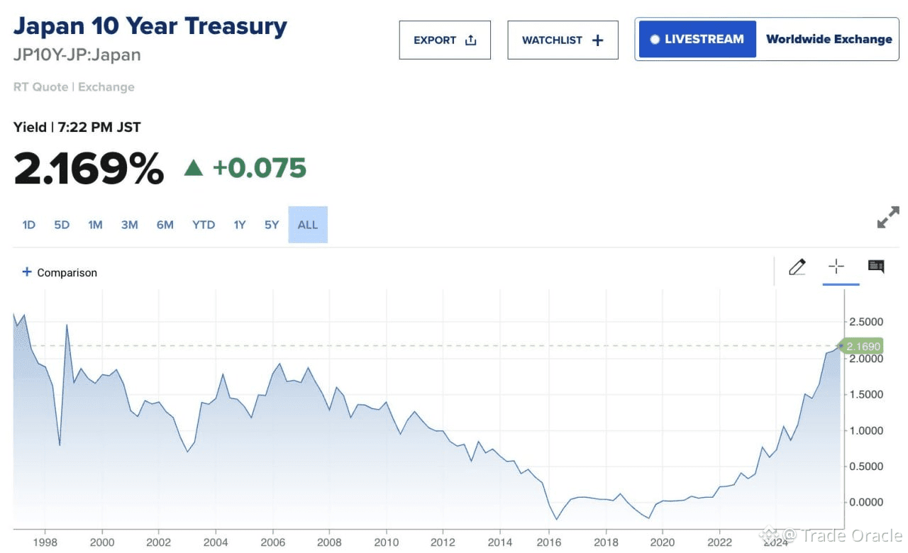 📊 Japan’s 10-year government bond yield has surged to 2.17%, marking its highest level since 1999, according to Barchart. This isn’t just a number — it’s a signal 🚨.