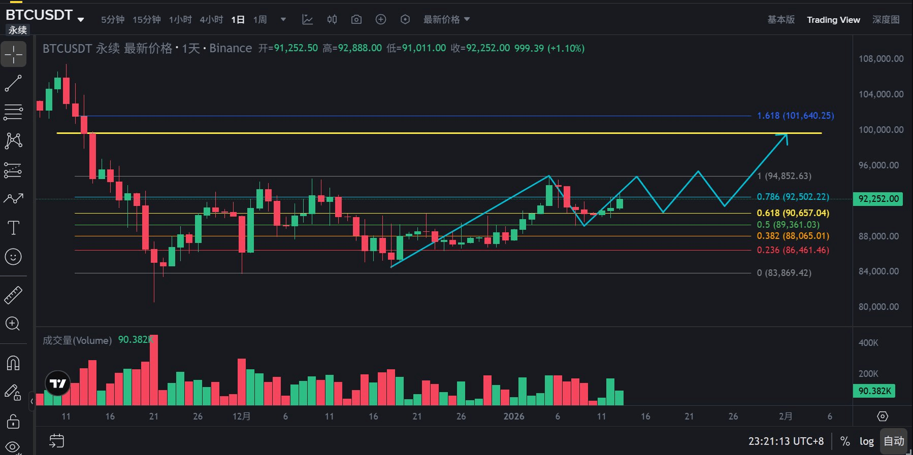 1) Se non ci saranno notizie negative significative o eventi neri, il prezzo del BTC salirà in modo oscillante fino a 98.500-100.000 prima della fine di febbraio; la dinamica precisa è illustrata nella Figura 2, il grafico di proiezione giornaliera;