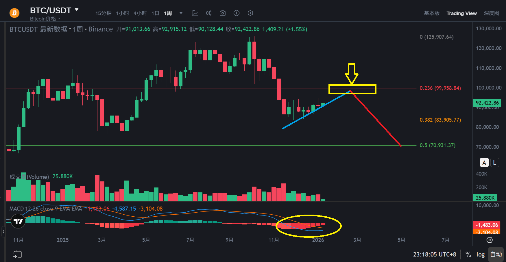 1) Settimanale: i minimi dei prezzi si alzano gradualmente, si prevede un incrocio rialzista di MACD in basso, il trend ribassista si indebolisce mentre il trend rialzista si rafforza, questo è chiaramente un rimbalzo di tipo B a livello settimanale, seguito da un'onda C ribassista;