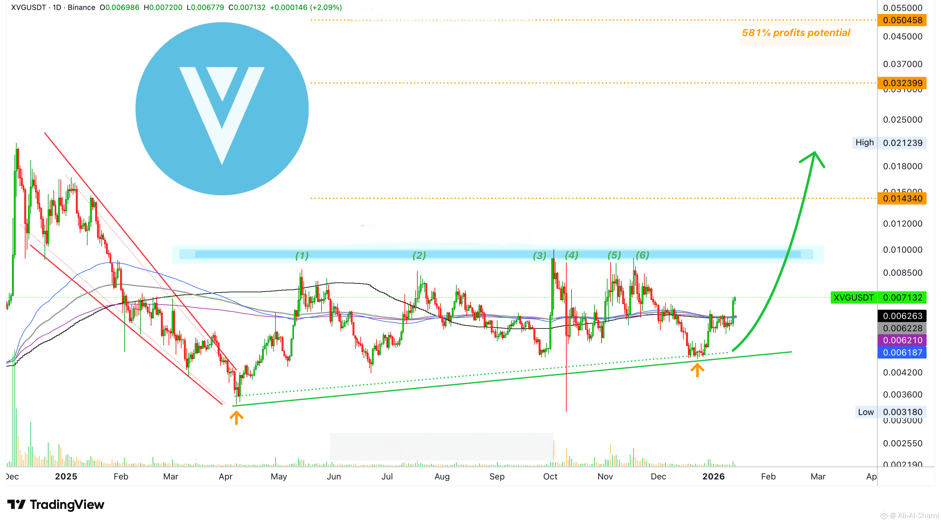 فقط بالأمس، تمكّنت Verge من كسر وإغلاق فوق جميع المتوسطات المتحركة التي نراقبها، بما في ذلك تلك طويلة الأجل مثل MA200، EMA377، EMA233 و EMA144. يمكنك رؤية هذه المتوسطات مرسومة على الرسم البياني. هذا هو الحركة والإشارة.