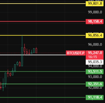Oggi la tendenza diventerà debole solo se si rompe il livello 95, iniziando un ritracciamento a livello orario; prestare attenzione ai livelli di supporto inferiori vicino a 93510-92350-91120!#BTC走势分析