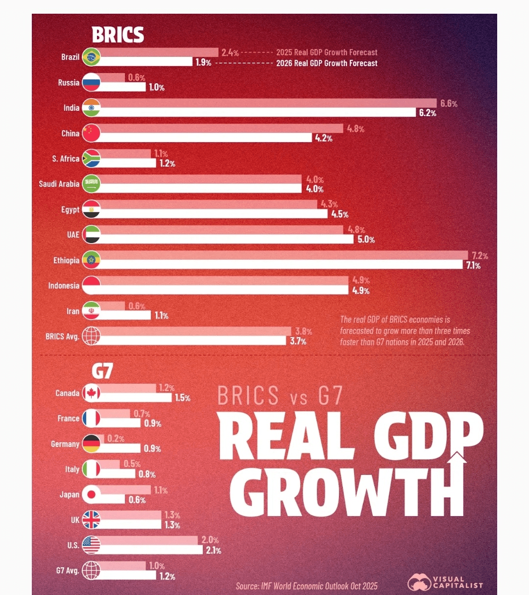 La crescita del PIL dei BRICS potrebbe triplicare quella del G7 nel 2026 đ