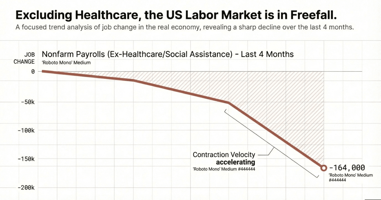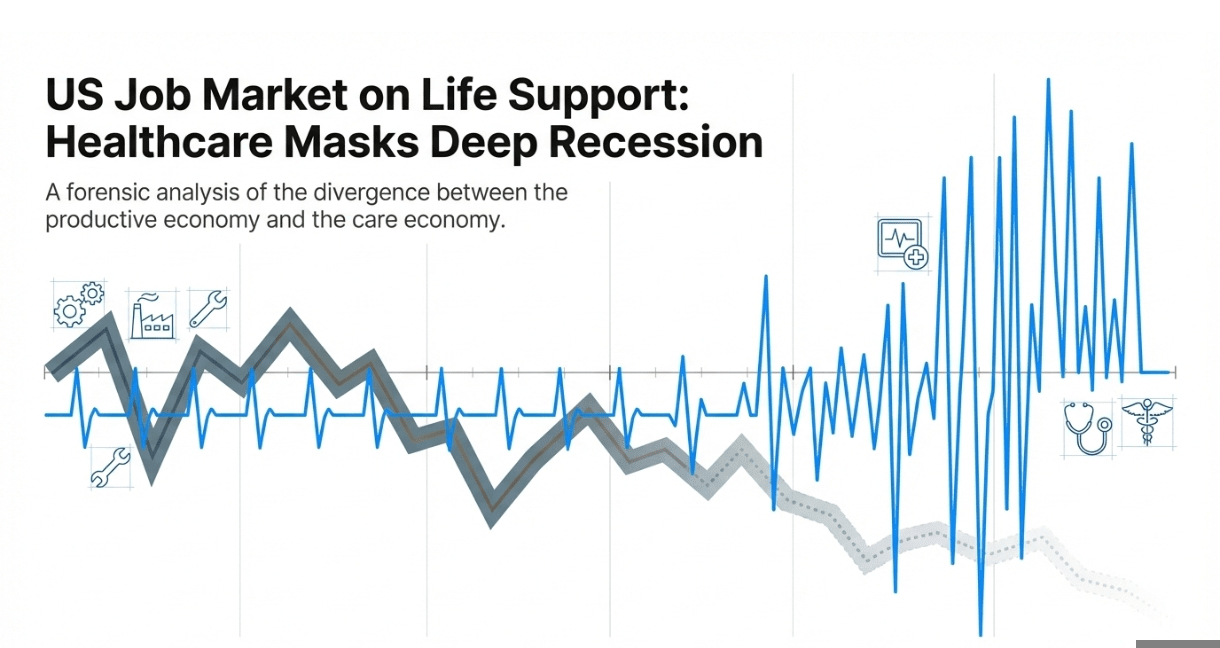 I dati principali suggeriscono che il mercato del lavoro statunitense sta piegandosi ma non spezzandosi. Tuttavia, un'analisi più approfondita rivela una realtà molto più cupa: l'economia produttiva sta già contraggendo, e l'unico fattore che tiene a galla il mercato del lavoro è un'enorme espansione non ciclica nel settore sanitario. Quando si elimina questo singolo settore, il mercato del lavoro statunitense non si sta semplicemente raffreddando, ma è in una caduta libera ricorsiva.