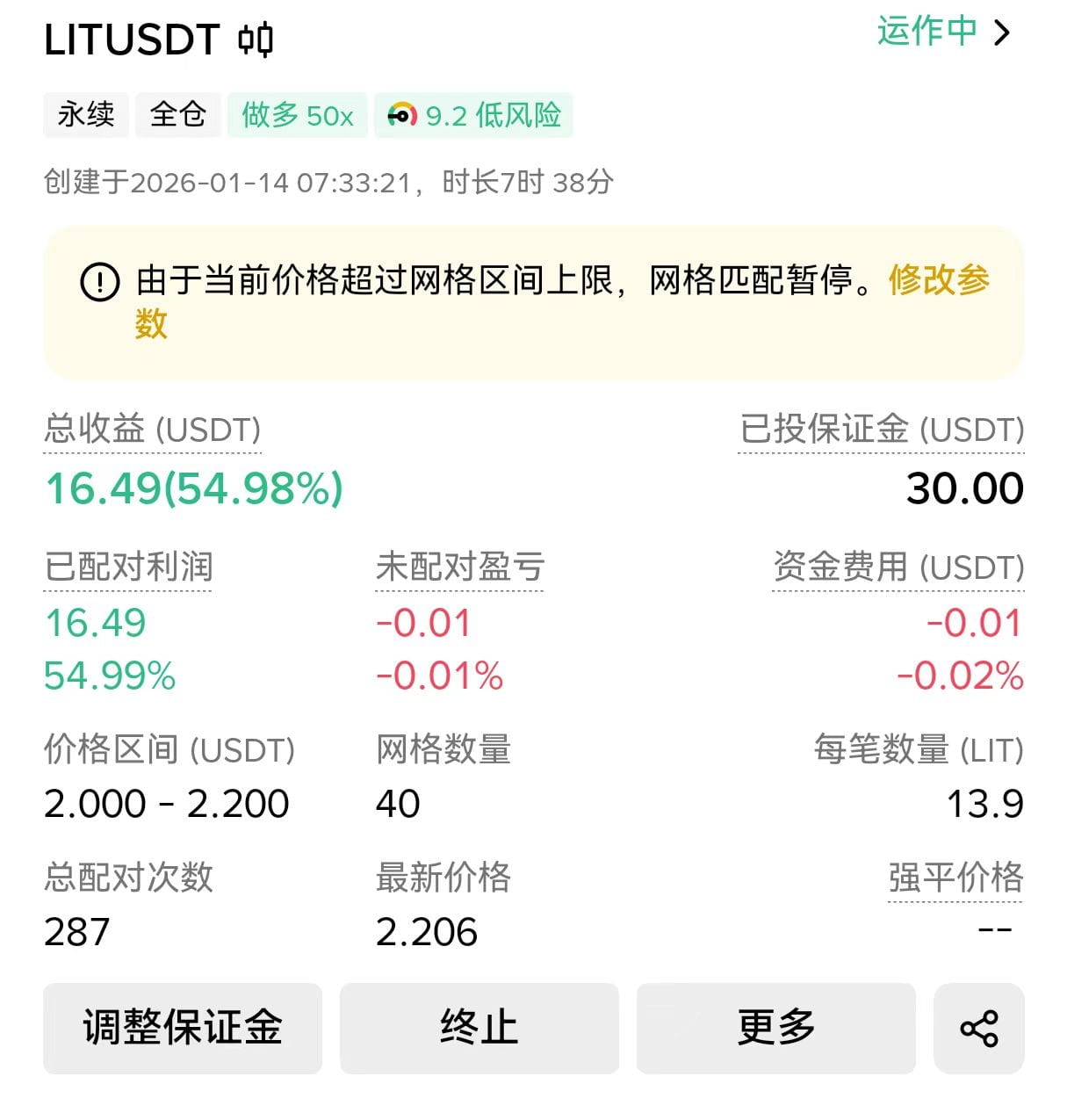 我今天设置了一个#Lıt 机器人,因为今天整体行情大涨,但是lit压根不动,然后它的波动还不小,我合约里已经开了lit的仓位,价格是2.8,是我拿到空投的套保仓位,只是相当于拿住空投没卖,没有打算加仓,但是跌到现在这个价格,我又感觉很有吸引力,所以决定开一个机器人跑一跑,设置的价格区间是2-2.2,网格数量40,每格利润大概0.2%,目前匹配287次,总利润16,保证金30,另加了170的保证金,防止不够。