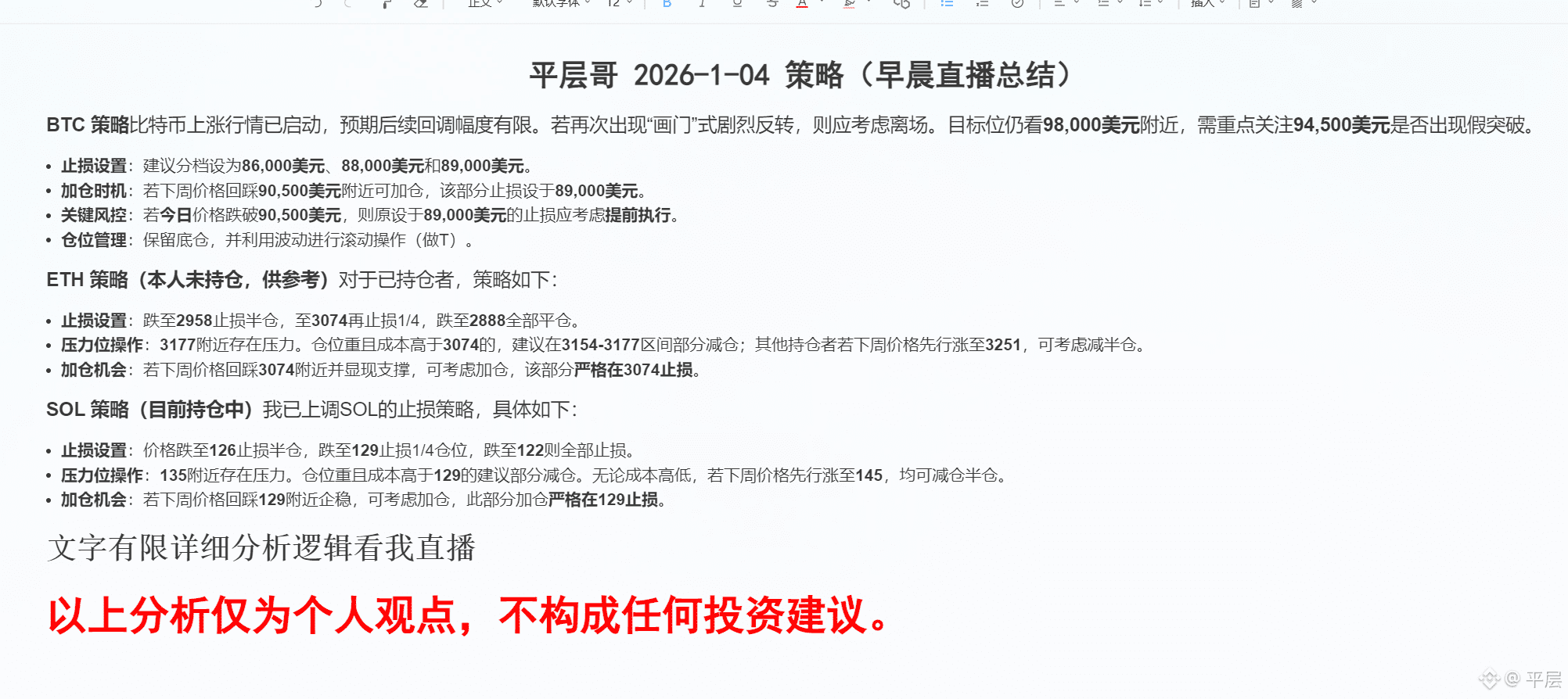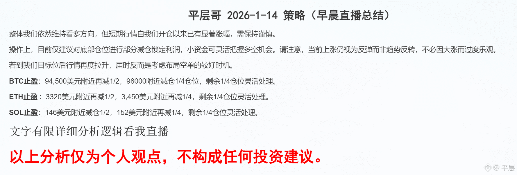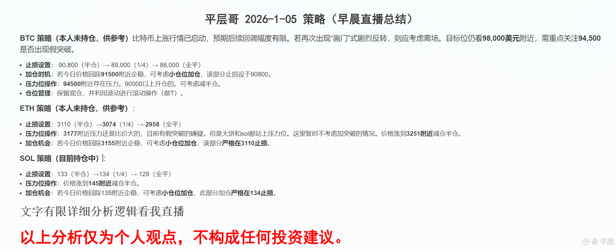 兄弟们好,平层哥这边来做一个近一个月的策略复盘。这轮行情经历了多次 "画门"洗盘、假突破诱空、圣诞假期缩量震荡,但我们始终坚持一个核心:看多不做空,严格止损,保留底仓滚动做T。